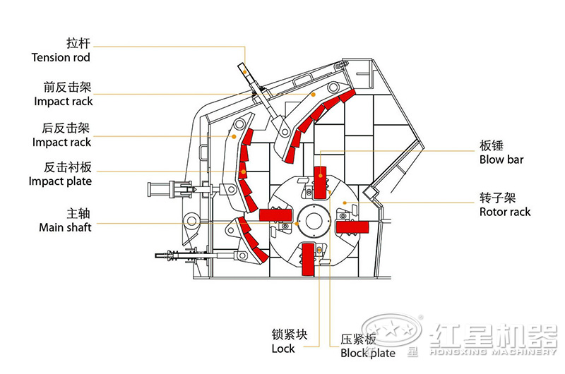 破碎的力來(lái)自兩方面,一方面是物料間的互相碰擊產(chǎn)生的作用力。另一方面,物料受到板錘的打擊、與反擊板的沖擊產(chǎn)生的力,這些力共同作用物料,使物料不斷產(chǎn)生裂縫,松散而致粉碎。當(dāng)物料粒度小于反擊板與板錘之間的縫隙時(shí),就被卸出。調(diào)整反擊架與轉(zhuǎn)子之間的間隙可達(dá)到改變物料出料粒度和物料形狀的目的。