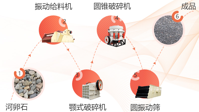 篩分機(jī)篩分出的不符合規(guī)格的河卵石要重新返回圓錐破碎機(jī)中再次破碎機(jī),直到符合成品規(guī)格的要求。