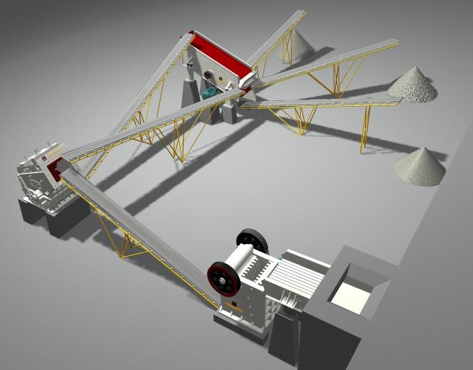 石子破碎生產(chǎn)線的生產(chǎn)流程大致為:(料倉(cāng))->振動(dòng)給料機(jī)->鄂式破碎機(jī)->反擊式破碎機(jī)->振動(dòng)篩->(成品石料),各設(shè)備中間以溜槽或皮帶輸送機(jī)相連。