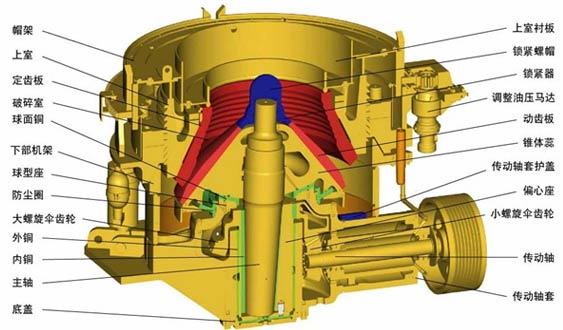 圓錐式破碎機主要由機架、定錐總成、動錐總成、彈簧機構(gòu)、碗型軸架部以及傳動等部分組成。另外圓錐式破碎機輔助部分由電氣系統(tǒng)、稀油潤滑系統(tǒng)、以及液壓清腔系統(tǒng)組成。以下是介紹圓錐式破碎機的結(jié)構(gòu)組成。